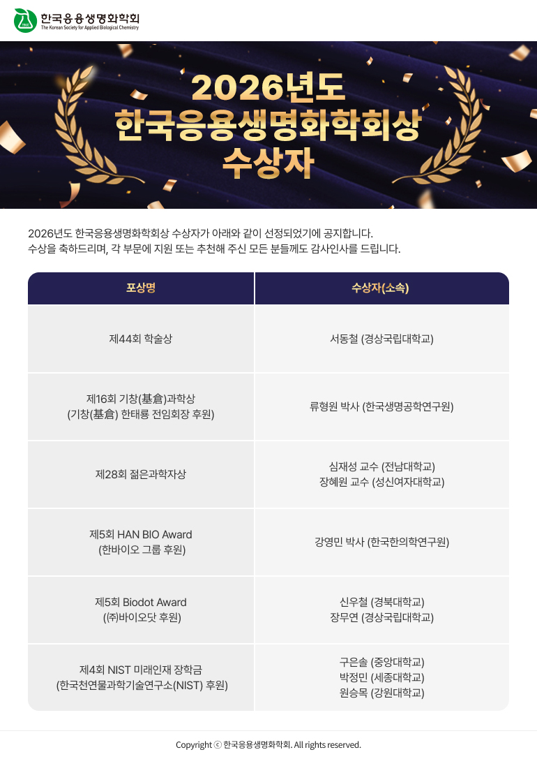 2026년도 한국응용생명화학회상 수상자 공지